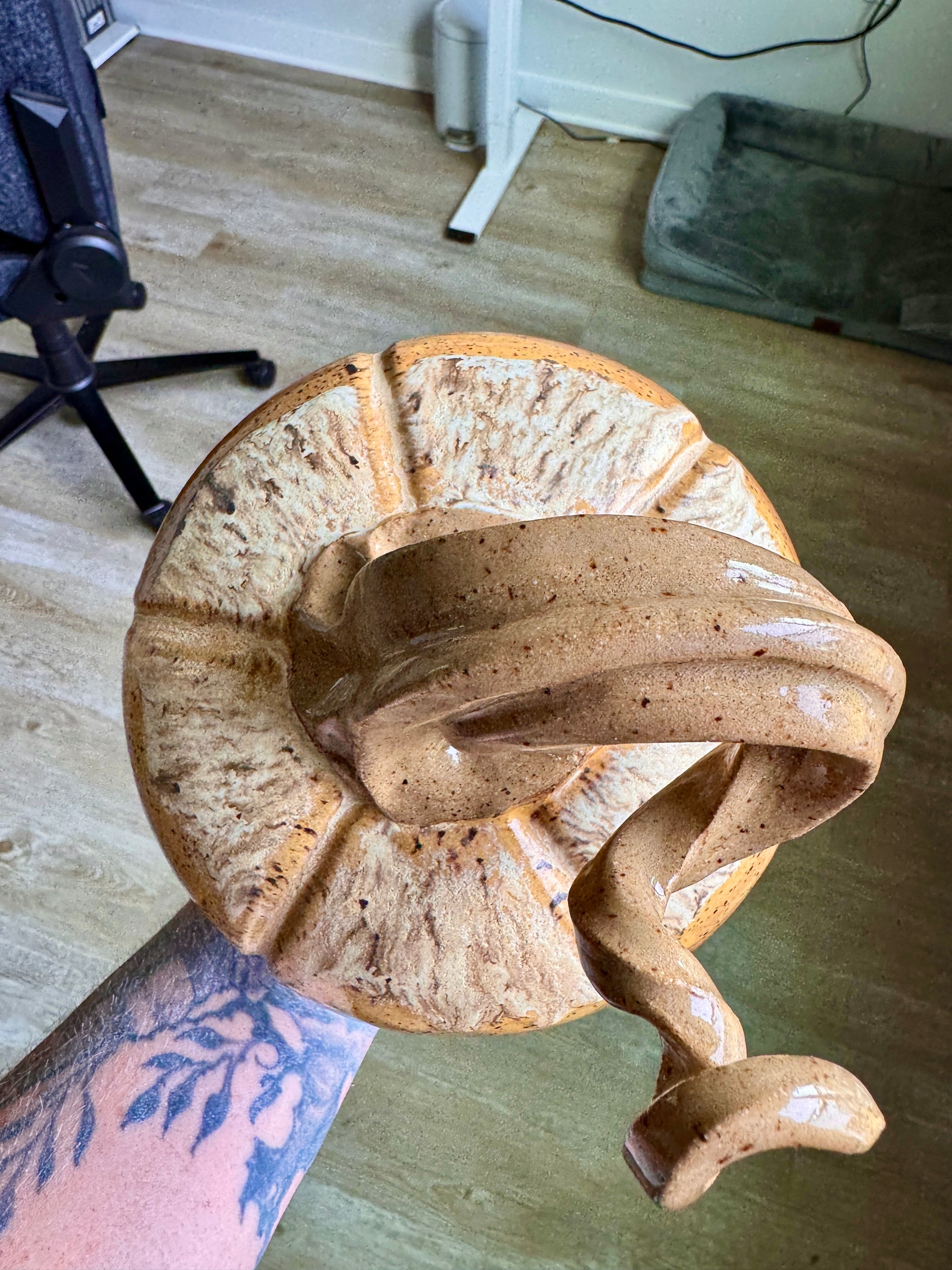 The Golden Harvest Pumpkin glows with the warmth of autumn fields at sunset. Hand-thrown and sculpted with a curling stem, this pumpkin is glazed in a golden amber with natural speckling from the clay body, giving it a rustic yet refined charm. A lighter wash around the stem cascades into earthy tones, creating movement and depth that feels alive.